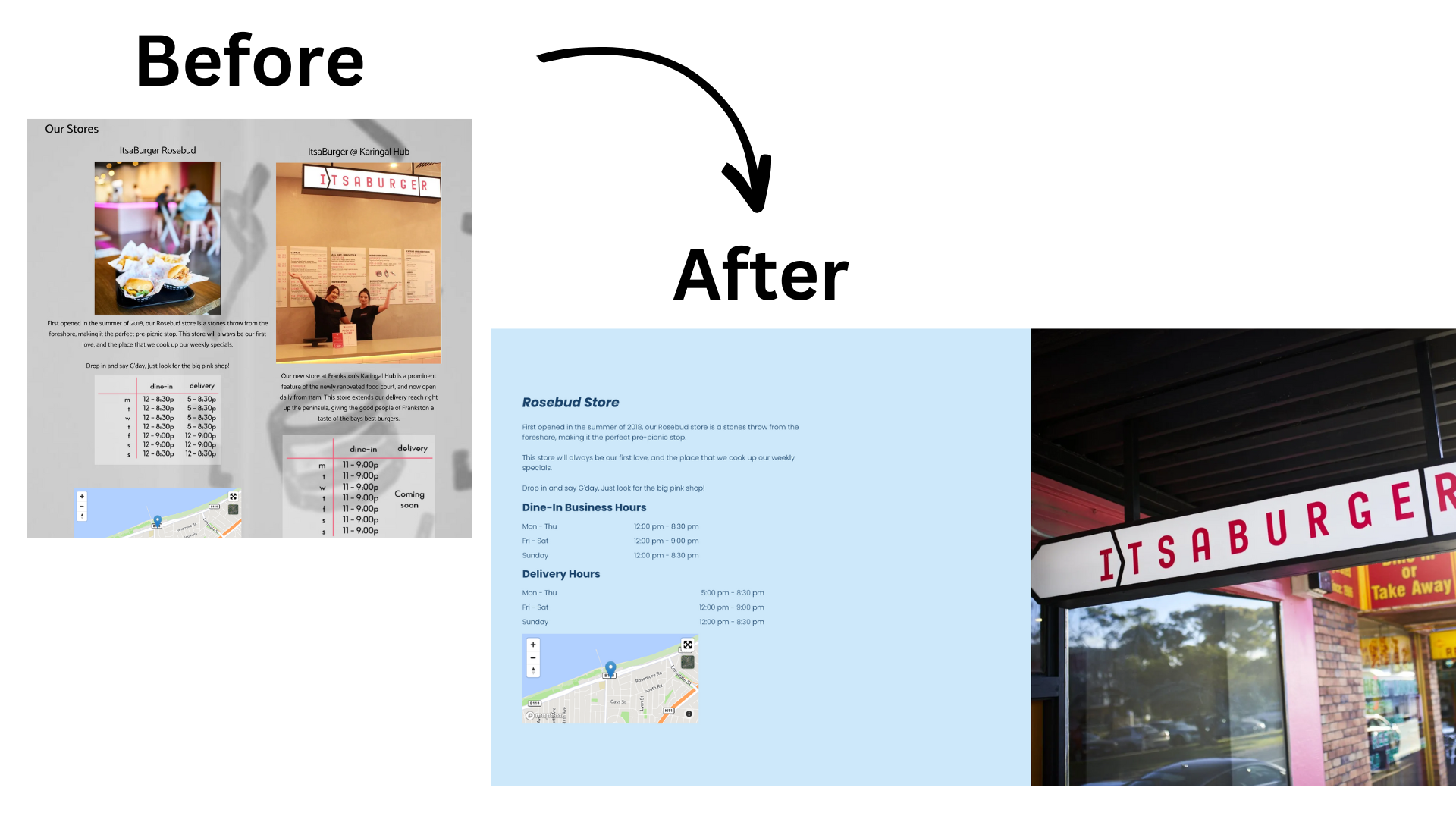 Like many businesses, the website is not the only presence it has, but physical locations and stores. For ItsaBurger, showing customers their store location and opening hours is important to retain existing customers.