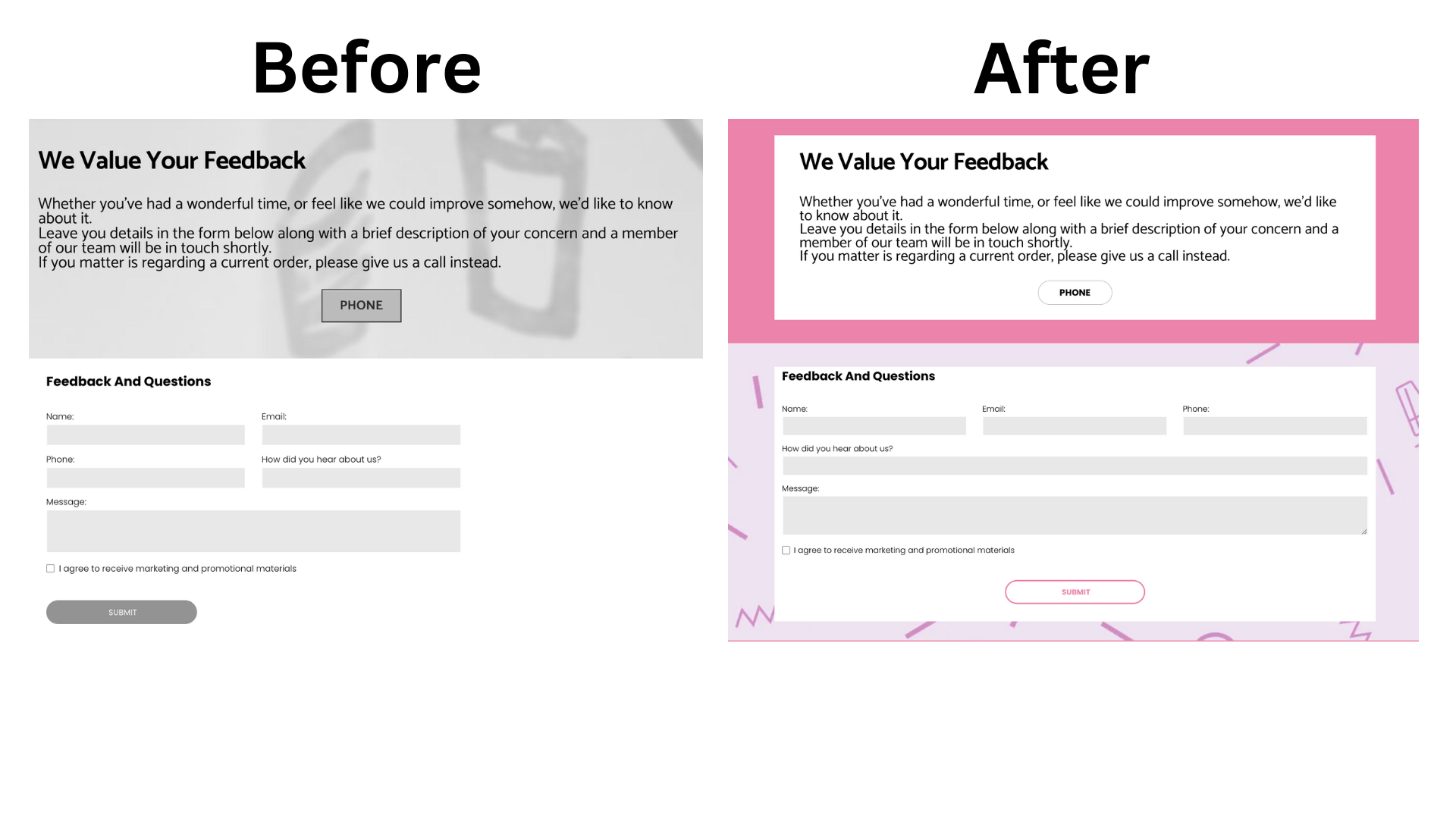 To achieve this, we made sure the text boxes pops out from the background. The two buttons 'Phone' and 'Submit' are now a consistent shape, and both aligned to the middle, so that the page is well balanced.